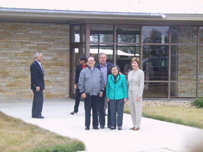 會談后,布什總統(tǒng)駕車陪同江主席夫婦參觀他的牧場。中午布什夫婦在家中設(shè)宴款待江澤民和夫人。