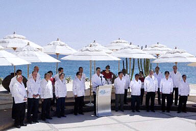 記者看到,上午八時(shí)半左右,墨西哥總統(tǒng)?怂辜丛跁(huì)場(chǎng)外一一迎候與會(huì)者。九時(shí)許,按APEC傳統(tǒng),與會(huì)領(lǐng)導(dǎo)人和代表著東道主提供的特色民族服裝拍攝“全家!。與上屆上海峰會(huì)的中式唐裝相比,今天的“瓜亞貝拉”同樣極有“個(gè)性”,它是墨西哥東南部流行的一種傳統(tǒng)服裝,為精一色的白色,有四個(gè)胸袋。合照背景為太平洋碧藍(lán)的大海,藍(lán)白相襯,在美麗的洛斯卡沃斯留下了一道亮麗的風(fēng)景線。