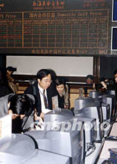 上海黃金交易所三十日正式開業(yè),標志著中國長達半個世紀的黃金管制徹底結(jié)束,亦表明中國由貨幣市場、證券市場、保險市場、外匯市場和黃金市場所組成的主要金融產(chǎn)品交易市場全部建成。圖為上海黃金交易所交易大廳。作者:姜煜