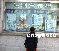 為確保社會治安穩(wěn)定,迎接十六大的勝利召開,上海市各區(qū)法院在法院門口開設(shè)了法院宣傳欄,為上海市民宣傳法律知識。井韋 攝