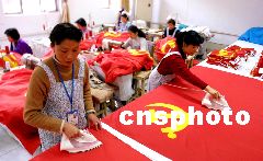 圖:假日加班趕制黨旗迎十六大