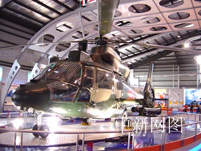 航空二集團的其展區(qū)突出位置展示一架國產(chǎn)直-9武裝直升機.