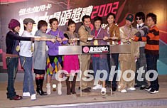 眾年輕偶像候選歌星11月4日在香港出席“新城勁爆頒獎禮2002記者會”。新城電臺行政總裁甘國亮(中)與角逐“新城勁爆人氣歌手”最強(qiáng)五男五女之歌手主持揭幕儀式。鄧慶樂 攝