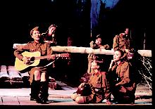 導(dǎo)演將這出戲定位為“詩化現(xiàn)實主義戰(zhàn)爭劇”,并用觀賞性很強的俄羅斯歌舞來調(diào)劑原本凝重慘烈的氣氛。既有表現(xiàn)女兵青春形象的歡快的歌曲,也有烘托戰(zhàn)爭殘酷的悲傷曲調(diào),更有象征俄羅斯精神的激昂旋律。