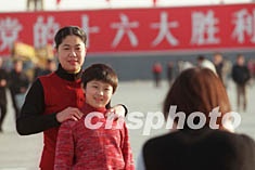 十一月五日,北京天安門(mén)廣場(chǎng)完成了配合“十六大”召開(kāi)而進(jìn)行的新布置。一對(duì)母女興致勃勃地與巨型“十六大”標(biāo)語(yǔ)合影留念。作者:張煒
