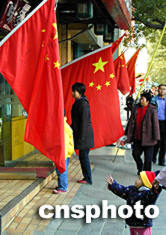 中新社北京十一月五日電(記者張素平)隨著中共十六大會(huì)期的漸近,北京街頭喜意漸濃,一面面鮮艷的國(guó)旗開始招展在北京的大街小巷。主要道路旁家家戶戶都在門前掛起國(guó)旗,紙制手持小國(guó)旗亦持續(xù)熱銷。