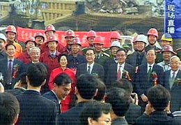 今天的截流儀式于上午9:05時(shí)開始。中共中央政治局常委、全國人大常委會(huì)委員長李鵬,中共中央政治局委員、國務(wù)院副總理吳邦國,全國人大常委會(huì)副委員長鄒家華,以及有關(guān)部門負(fù)責(zé)同志,國家計(jì)委、經(jīng)貿(mào)委、財(cái)政部、國土資源部、交通部、國務(wù)院三峽辦、重慶市、湖北省的有關(guān)領(lǐng)導(dǎo)同志等在現(xiàn)場觀看截流儀式。在主席臺(tái)和嘉賓席就坐的嘉賓共有1000多人。另外,數(shù)以萬計(jì)的群眾到現(xiàn)場觀看此次壯舉。