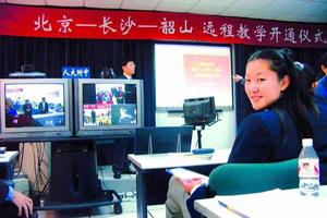 中新網(wǎng)11月7日電 昨天下午,“北京—長沙—韶山遠程教學(xué)直通車”正式開通。北京人大附中、湖南長沙一中和韶山學(xué)校高二的幾十名同學(xué)在各自的遠程教室上了一堂別開生面的課。這是我國首次實現(xiàn)跨省區(qū)實時交互式的遠程教學(xué)。