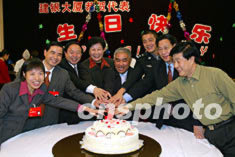 出席中國共產黨第十六次全國代表大會的蘇新添(右四)等八名代表十日在北京建銀大廈駐地喜切蛋糕,度過快樂生日。作者:毛建軍