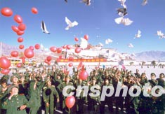 武警西藏總隊(duì)官兵在拉薩布達(dá)拉宮廣場(chǎng)打起威風(fēng)鑼鼓,放飛和平鴿和紅汽球,熱烈慶祝中共十六大召開(kāi)。作者:趙艷志