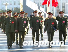 中國軍方高級將領(lǐng)的黨代表們,十四日清晨在北京出席中共十六大閉幕會。
