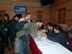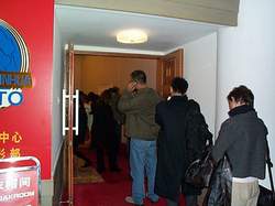 央視國(guó)際播發(fā)專稿報(bào)道說(shuō),今天下午,記者在十六大新聞中心外國(guó)記者接待處見(jiàn)到,等候領(lǐng)取新常委見(jiàn)面會(huì)請(qǐng)柬的外國(guó)記者排起了長(zhǎng)長(zhǎng)的隊(duì)伍,一直延伸到接待處的大門口外。