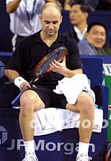 阿加西在上海結束了十四日的比賽之后,正式宣布因傷退出本屆余下的比賽。圖為阿加西因傷在場邊休息。作者:湯彥俊