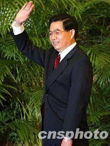 圖為胡錦濤總書記向中外記者介紹新當選的常委們。
