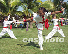 海南島海口市的青少年業(yè)余武術(shù)訓(xùn)練中心的小朋友表演武術(shù),為中共十六大閉幕起舞助興。作者:王辛莉