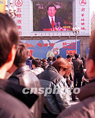 十一月十五日,新一屆中共中央政治局常委通過電視直播與民眾見面。北京火車站廣場(chǎng)的大屏幕前站滿了觀看直播的市民,胡錦濤出任總書記成為關(guān)注焦點(diǎn)。作者:張宇