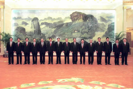 中新社北京十一月十五日電 中國國家主席、中央軍委主席江澤民和十五屆中央政治局其他常委李鵬、朱镕基、李瑞環(huán)、尉健行、李嵐清,新當(dāng)選的中共中央總書記胡錦濤和十六屆中央政治局其他常委吳邦國、溫家寶、賈慶林、曾慶紅、黃菊、吳官正、李長春、羅干,今天下午在人民大會堂會見了出席十六大的全體代表,并同大家合影留念。