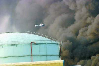 陳伯的兒子手指著火油船附近的一個(gè)頗大的黑色物體和區(qū)域內(nèi)的多座大型油罐告訴記者,那里是番禺番龍油庫(kù),黑色物體是油船著火第二次爆炸時(shí)被炸飛的船殼。他說,當(dāng)時(shí)一聲巨響之后,只見船殼‘飛天’,高度達(dá)30多米,場(chǎng)景真是驚人。