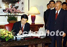 十一月十九日,香港特區(qū)政府在禮賓府設(shè)宴歡迎國務(wù)院總理朱镕基,朱總理在禮賓府題字留念。中新社傳真潘索菲攝