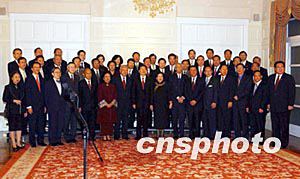 十一月十九日,香港特區(qū)政府在禮賓府設(shè)宴歡迎國務(wù)院總理朱镕基一行,朱镕基與賓客合影。中新社傳真潘索菲攝