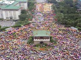 雖然有些縣市人數(shù)減少,但因地緣關(guān)系,北縣人數(shù)反而增加,從近午開始,中正紀(jì)念堂就開始人滿為患,從高處俯瞰,只見到黑壓壓一片,十分驚人。而國民黨主席連戰(zhàn)也在午后1時(shí),抵達(dá)現(xiàn)場向農(nóng)漁民“致意”。