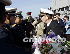 24日上午10時(shí)許,美國(guó)海軍“福斯特”號(hào)在艦長(zhǎng)約翰·尼高中校的率領(lǐng)下,徐徐駛?cè)肭鄭u港,開(kāi)始對(duì)青島進(jìn)行為期5天的友好訪問(wèn)。隨艦來(lái)訪官兵共353人,其中軍官26人,水兵327人。圖為北海艦隊(duì)官兵迎接福斯特號(hào)艦長(zhǎng)。作者:王松岐