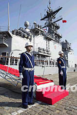 24日上午10時(shí)許,美國(guó)海軍“福斯特”號(hào)(FOSTER)驅(qū)逐艦,在艦長(zhǎng)約翰·尼高中校(John Nygard)的率領(lǐng)下,徐徐駛?cè)肭鄭u港,開(kāi)始對(duì)青島進(jìn)行為期5天的友好訪問(wèn)。圖為中國(guó)士兵為美國(guó)海軍“福斯特”艦站崗。作者:王松岐