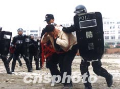 26日,成都首次反恐怖演習(xí)。圖為在A國(guó)駐蓉辦事處門前參與鬧事者,在準(zhǔn)備逃跑時(shí)被民警用高科技裝備“網(wǎng)槍”網(wǎng)住。作者:劉真