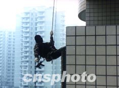 26日,成都首次反恐怖演習(xí)。在處置恐怖分子對(duì)某跨國(guó)公司辦公大樓實(shí)施的劫持人質(zhì)的演習(xí)中,特警秘密潛入大樓,準(zhǔn)備伺機(jī)行動(dòng)。作者:劉真