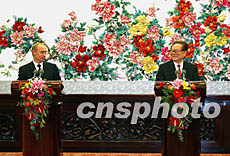 中國國家主席江澤民與俄羅斯總統(tǒng)普京二日在北京人民大會(huì)堂舉行會(huì)談并出席簽字儀式后,共同會(huì)見中外記者。作者:毛建軍