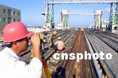 12月2日,隨著最后一根長25米的特制鐵軌,成功鋪設在粵海鐵路南港棧橋橋面,全長8738米的粵海鐵路南港棧橋鐵軌與?诨疖囌捐F軌接軌。至此,中國第一條跨海鐵路粵海鐵路南北港碼頭鐵路線全線貫通。圖為施工人員在南港棧橋上進行測量和鋪軌工作。古月 攝