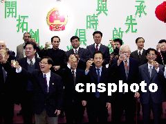 紐約中國和平統(tǒng)一促進會十二月十五日舉行中共十六大成果圖片展。圖為中國駐紐約總領事張宏喜和紐約中國和平統(tǒng)一促進會會長花俊雄、紐約華人社團聯(lián)合總會主席梁冠軍等紐約僑界人士在展覽開幕式上共同舉杯,祝愿中國國運昌盛、明天更好。趙海燕 攝