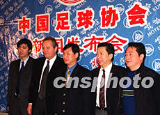 中國足球協(xié)會二十二日在北京正式宣布荷蘭人阿里·哈恩成為中國國家足球隊(duì)主教練。圖為金志揚(yáng)、朱元和、南勇、阿里·哈恩(從右至左)等人在新聞發(fā)布會上。作者:武仲林
