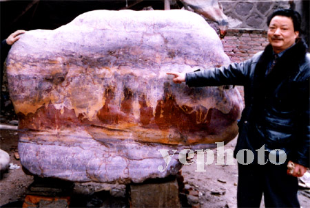 李發(fā)軍見石頭上有青紫、紫紅、灰黑、乳白、米黃等5種色彩,石面中下部有一帶紫紅色山峰,峰下是一帶米黃色水浪,上部是遠(yuǎn)山和浮云,整個畫面酷似一幅長江三峽夔門風(fēng)雨群峰圖。