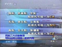 據(jù)中央電視臺(tái)報(bào)道,2003年1月1日起,重組后的國(guó)航、東航、南航三大民航運(yùn)輸集團(tuán)的航班代號(hào)將分別統(tǒng)一為CA、MU和CZ,同時(shí)西南航、中航、西北航、云南航、北方航、新疆航原有代號(hào)將不再使用。統(tǒng)一航班代號(hào)后,三大航空集團(tuán)的飛機(jī)也將分別統(tǒng)一標(biāo)志和名稱(chēng),常旅客計(jì)劃也將實(shí)現(xiàn)內(nèi)部統(tǒng)一,擴(kuò)展了常旅客會(huì)員累積里程和兌換獎(jiǎng)勵(lì)的航班范圍。同時(shí)三大運(yùn)輸集團(tuán)還將分別統(tǒng)一航空餐食標(biāo)準(zhǔn)。為了保證航班運(yùn)行正常和平穩(wěn)過(guò)渡,三大集團(tuán)近期不會(huì)對(duì)航班計(jì)劃和航線布局做大的調(diào)整。
