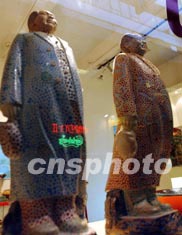 十二月二十六日,在香港街頭一家雕塑藝術店的櫥窗里,擺放著兩尊風格別樣的毛澤東藝術像。中新社傳真 錢興強 攝