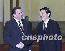 朱镕基首先對施羅德出任總理以來第四次訪華表示歡迎。他說,德國長期以來是中國在歐洲最大的貿(mào)易和技術(shù)合作伙伴,預(yù)計今年兩國貿(mào)易將再創(chuàng)新高。德國對華投資也逐年增加,其中很多是大項目。上海磁浮列車的建設(shè)成功是中德經(jīng)貿(mào)關(guān)系史上值得祝賀的一件大事。兩國還加強了在文化、科技、教育、法律等領(lǐng)域的交流與合作,雙邊關(guān)系的內(nèi)涵不斷充實。