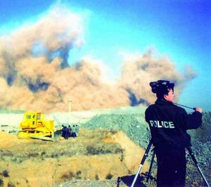 11點(diǎn)30分,爆破總指揮宣布一切正常。爆破現(xiàn)場(chǎng)第一次警報(bào)響起。爆破現(xiàn)場(chǎng)值勤民警開始檢查是否還有人員在爆破區(qū)域內(nèi)停留。一切在爆破區(qū)域內(nèi)的人員撤離至安全地點(diǎn)。16個(gè)爆破觀測(cè)點(diǎn)開始觀測(cè)。