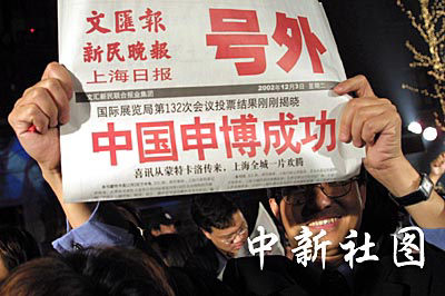 三日晚,在摩納哥夢特卡洛舉行的國際展覽局第132次會議上,中國上海通過激烈竟?fàn)帿@得2010年世界博覽會主辦權(quán),當(dāng)中國申博成功的喜訊從蒙特卡洛傳來的時候,上海全城沉浸在一片歡樂之中。圖為申城市民在為中國申博成功歡呼。作者:湯彥俊