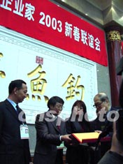 來自世界各地的華人企業(yè)家三日在北京釣魚臺舉行新春聯(lián)誼會。全國政協(xié)副主席孫孚凌(右一)到會為多名貢獻(xiàn)突出的華人頒發(fā)“華人企業(yè)家證書”。作者:王麗南