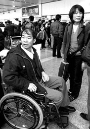 昨天下午5點(diǎn)40分。首都國際機(jī)場國際到港出口處。在推著大包小包行李的人流中,一個頭發(fā)稀疏的中年男子坐在輪椅上被緩緩?fù)瞥。他就是?002年4月12日以色列耶路撒冷爆炸案中受傷的中國勞工林金謀。