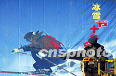 一名工人五日在哈爾濱街頭張掛冰雪運(yùn)動宣傳畫,為五日晚在這里開幕的國第十屆冬季運(yùn)動會暨第十九屆哈爾濱國際冰雪節(jié)造勢。作者:毛建軍