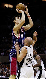 據(jù)朝鮮日?qǐng)?bào)報(bào)道,姚明在接受當(dāng)?shù)孛襟w的采訪時(shí)說(shuō):“我非常感到幸福和光榮,如果出戰(zhàn)全明星賽,我一定要比出道戰(zhàn)表現(xiàn)的更好!睂(shí)際上,姚明在他NBA的處女賽中一分未得(兩個(gè)籃板),與他的NBA新?tīng)钤闵矸莶环?墒且γ饕运?米26的身高很快適應(yīng)了NBA的比賽節(jié)奏,作為最出色的新人號(hào)令天下。