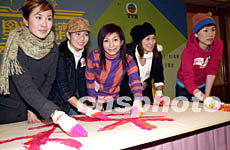 大型慈善籌款節(jié)目「慈善星輝仁濟(jì)夜」1月8日在香港舉行記者會(huì),藝員葉璇、張美妮、朱凱婷、姚嘉妮、劉曉彤(圖左起)在會(huì)上“即席揮毫”作畫(huà)。鄧慶樂(lè) 攝