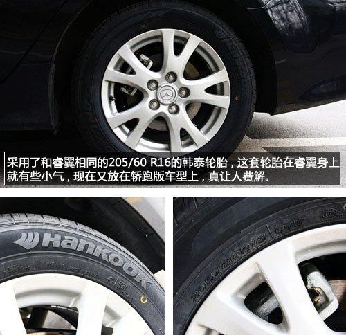 睿翼轎跑車的尾部也與普通版不同,順滑圓潤的C柱設(shè)計比普通版車型看上去更加動感,不過這樣也會損失一些后排乘客的頭部空間,后備箱采用了掀背式設(shè)計,連同后車窗一起開啟,開口很大,讓消費者可以更加從容的取放大件物品,而后備箱開啟按鈕的設(shè)計則與睿翼沒有區(qū)別。最大的遺憾就是我們在這款車型上看到的205/60 R16的韓泰輪胎,在睿翼身上就顯得有些小,搭配到睿翼轎跑上還沒有任何改進就有點說不過去了,這樣節(jié)約成本的方式實在讓人不解。