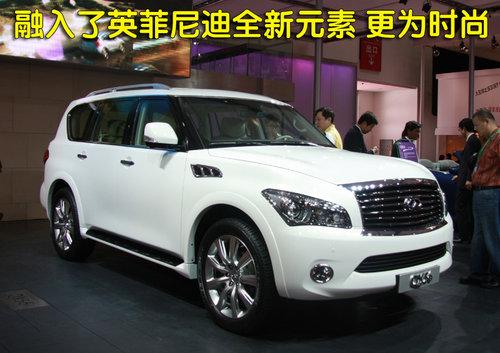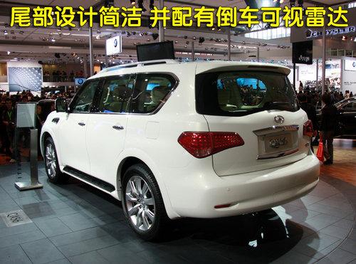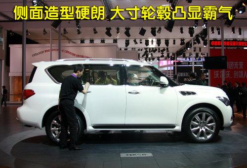 近年來(lái)SUV車型持續(xù)火爆,各廠商陸續(xù)推出新的車型以增加市場(chǎng)競(jìng)爭(zhēng)力。同時(shí)性能強(qiáng)悍,寬大舒適的大型SUV,也得到了一些具有獨(dú)特品位喜歡運(yùn)動(dòng)且資金富裕消費(fèi)者的最愛(ài),因此大型豪華SUV市場(chǎng)也受到了不少消費(fèi)者的關(guān)注。英菲尼迪是日系高端品牌中最具有藝術(shù)氣息的,今年在北京車展上就展出了全新一代的QX56,QX56作為一款7座豪華SUV車型,一經(jīng)推出就立刻受到了的中國(guó)消費(fèi)者的關(guān)注。近日我們從英菲尼迪4S店銷售人員處獲悉到,全新的英菲尼迪QX56將于今年9月份到店,預(yù)計(jì)售價(jià)160萬(wàn)元左右。銷售人員還表示,目前各4S店均已開(kāi)始接受預(yù)定,訂金10萬(wàn),第一批車主將于10月份提到現(xiàn)車。下面就讓我們回顧一下,在2010北京車展上見(jiàn)到的英菲尼迪QX56。