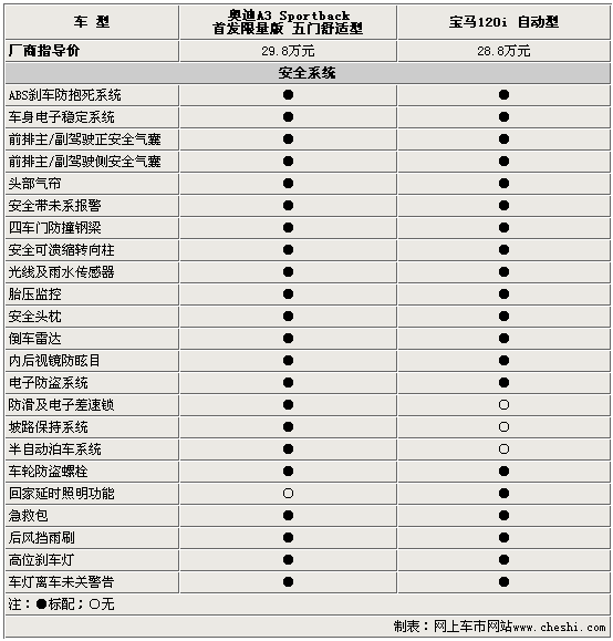 作為高品質(zhì)的德系緊湊型兩廂運(yùn)動(dòng)小車,兩款車型在安全性方面均體現(xiàn)了很高的水準(zhǔn)。除了在這個(gè)級(jí)別中常見(jiàn)的前排正/側(cè)以及頭部安全氣簾外,奧迪A3 Sportback首發(fā)限量版在安全方面的配置要高于寶馬120i,也顯得更為豐富周全。奧迪A3 Sportback首發(fā)限量版所配備的:防滑電子差速鎖、坡路保持以及半自動(dòng)泊車系統(tǒng)是既安全又實(shí)用的配置。
