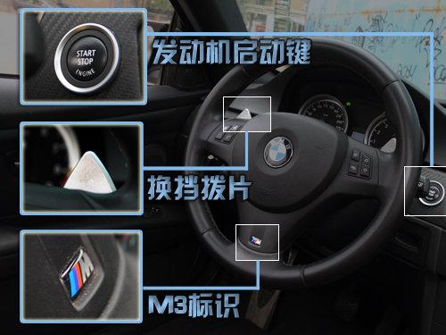 方向盤后則可以看到無鑰匙啟動按鈕,M3方向盤采用小尺寸三幅樣式,皮制包裹的觸感很棒,兩旁側(cè)翼設(shè)計有功能按鍵,使用起來安全又方便,下翼底端深深嵌入的M3標(biāo)志給予再次身份的提醒。換檔撥片的加入對于崇尚性能的車型來說是必不可少的,在降檔瞬間車身猛地彈出去時,又有多少人會舍得把手從這誘人的方向盤上挪開呢?
