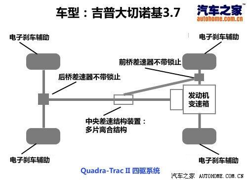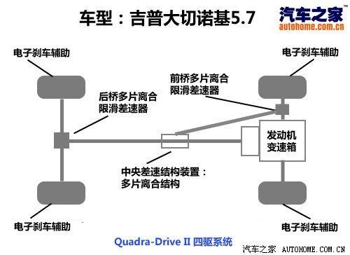 大切諾基采用前后整體橋的非獨(dú)立懸掛,這在結(jié)構(gòu)在本身上也偏重越野。進(jìn)入國內(nèi)的大切諾基有兩款車型,排量分別為3.7升和5.7升,兩款車型采用的四驅(qū)結(jié)構(gòu)并不相同,主要體現(xiàn)在3.7升車型前后軸上沒有差速鎖,盡管它的電子輔助系統(tǒng)也足夠強(qiáng)大,但在通過一些難度較大的交叉軸項(xiàng)目時,電子輔助還是比機(jī)械結(jié)合反應(yīng)緩慢一些。