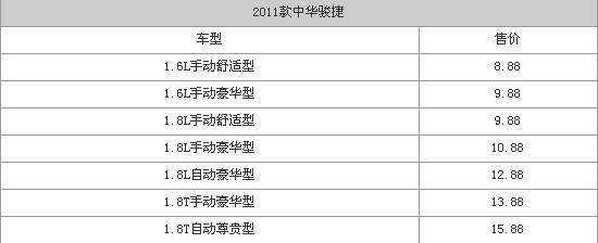 2010年7月8日,華晨中華正式推出了2011款駿捷車型,此次推出的新車共有7款不同配置的車型,分為1.6L、1.8L、1.8T三種動(dòng)力調(diào)教。據(jù)悉,新車整體的售價(jià)區(qū)間為8.88-15.88萬(wàn)元。